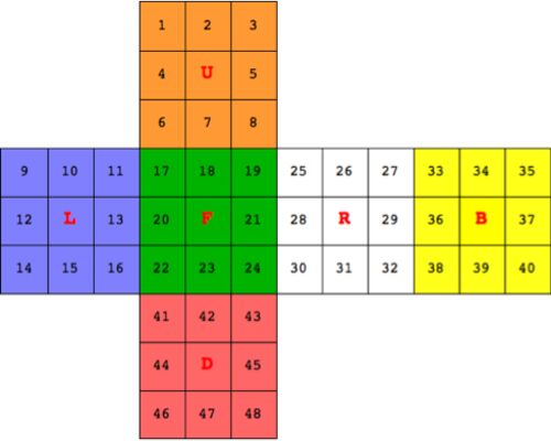 ルービックキューブの配置の番号付けと色については参考文献 1, 2 と 3 を参考に決め、展開図を次に示す。 小面にこのように番号を付けると、この配置は Mathematica のリスト Range[48] で表現できる。このリストを8個ずつ分割すると、最初の8個は up に属…