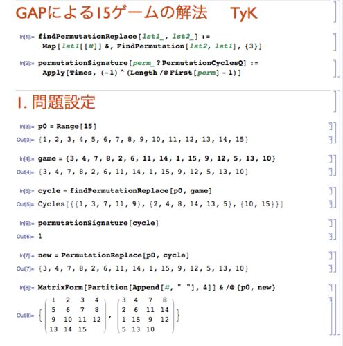 目次へ GAP による15ゲームの解法 TyK 平成21年9月9日 をグーグルで見つけた。この論文について GAP と Mathematica を使って読み解くことにする。 1. 問題設定 関数findPermutationReplaceを使って配置p0からgameへの巡回置換cycleを求める。 関数permutati…