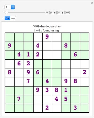 目次へ Sudoku 3495 hard, the guardian, Sat 16 Jul 2016 を Mathematica で解いた。 Sudoku 3495 hard Step by step の解答 このパズルは Naked Singles(裸のシングル) 、Hidden Singles(隠れたシングル) と HiddenPairs を使って答えが求まる。 この表の1…