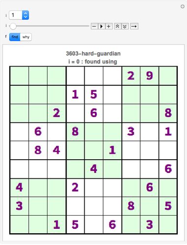 目次へ Sudoku 3603 hard, the guardian, Sat 26 Nov 2016 を Mathematica で解いた。 SUDOKUWiKI.ORG を参考にした。解き方の定石が書いてあります。 The Logic of Sudoku Sudoku 3603 hard 候補図 Step by step の解答 このパズルは NakedSingle (裸のシン…